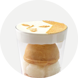 きなこたっぷりのクリームにもちもち道明寺粉のお団子、中段にはメープルクリームやゼリー、その下にニッキ風味のミックスナッツやオレンジピールが入っています。追いメープルシロップで洋風への味の変化をお楽しみください。