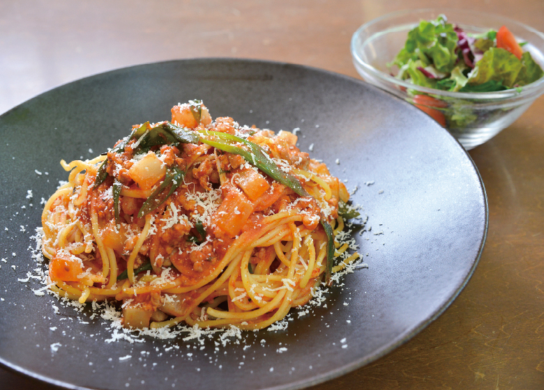 (豚肉のハーブマリネと大根、九条ネギのトマトソース)
